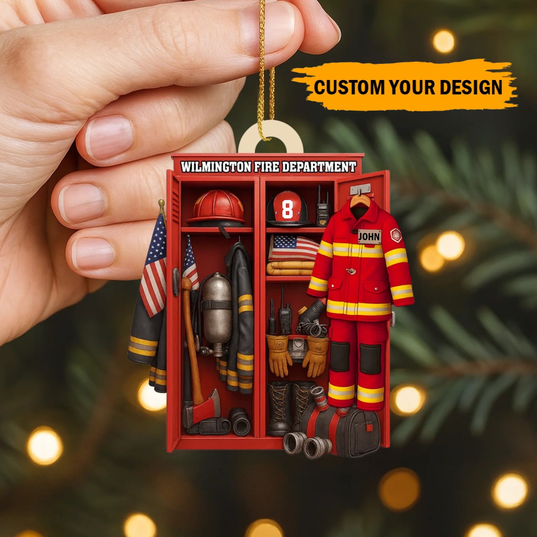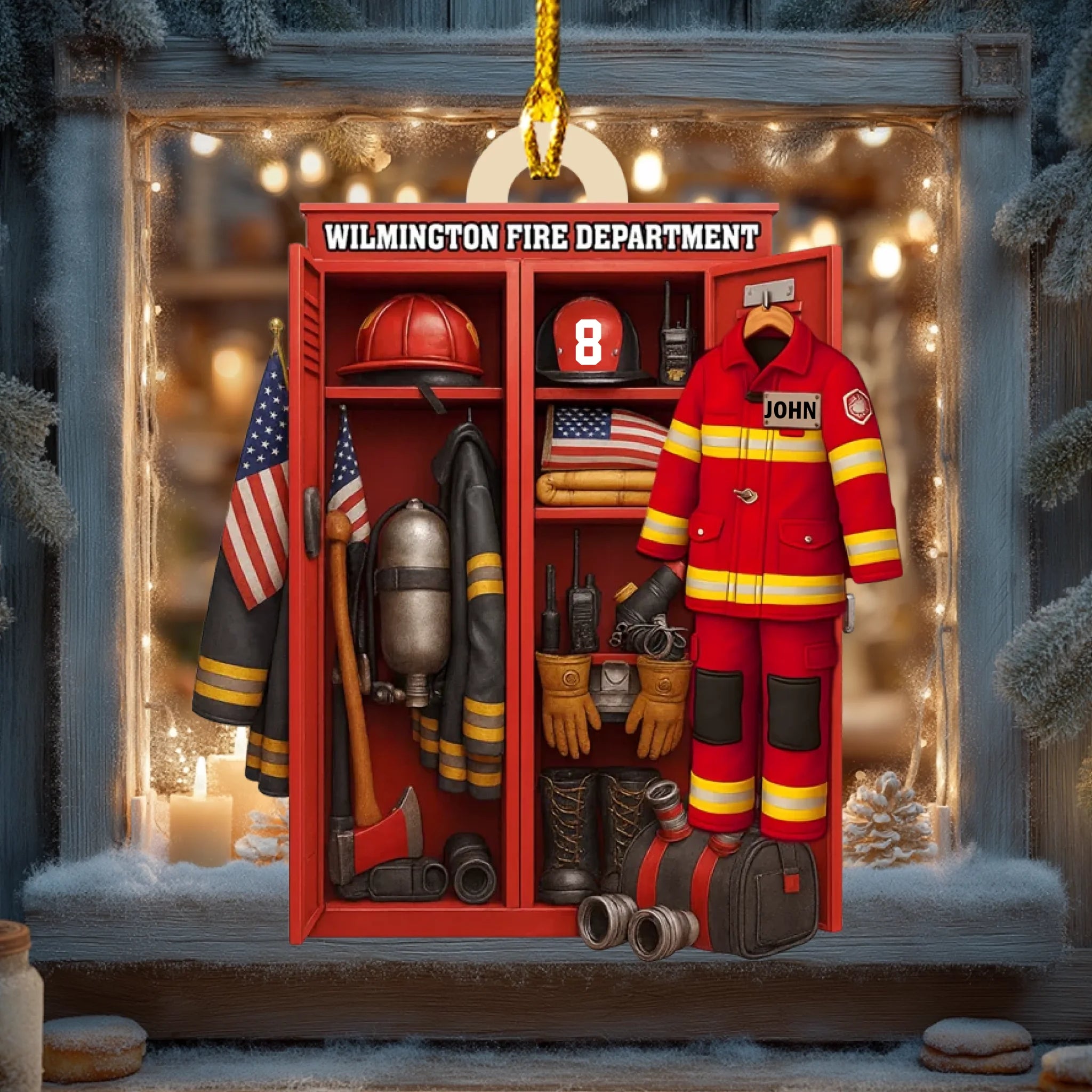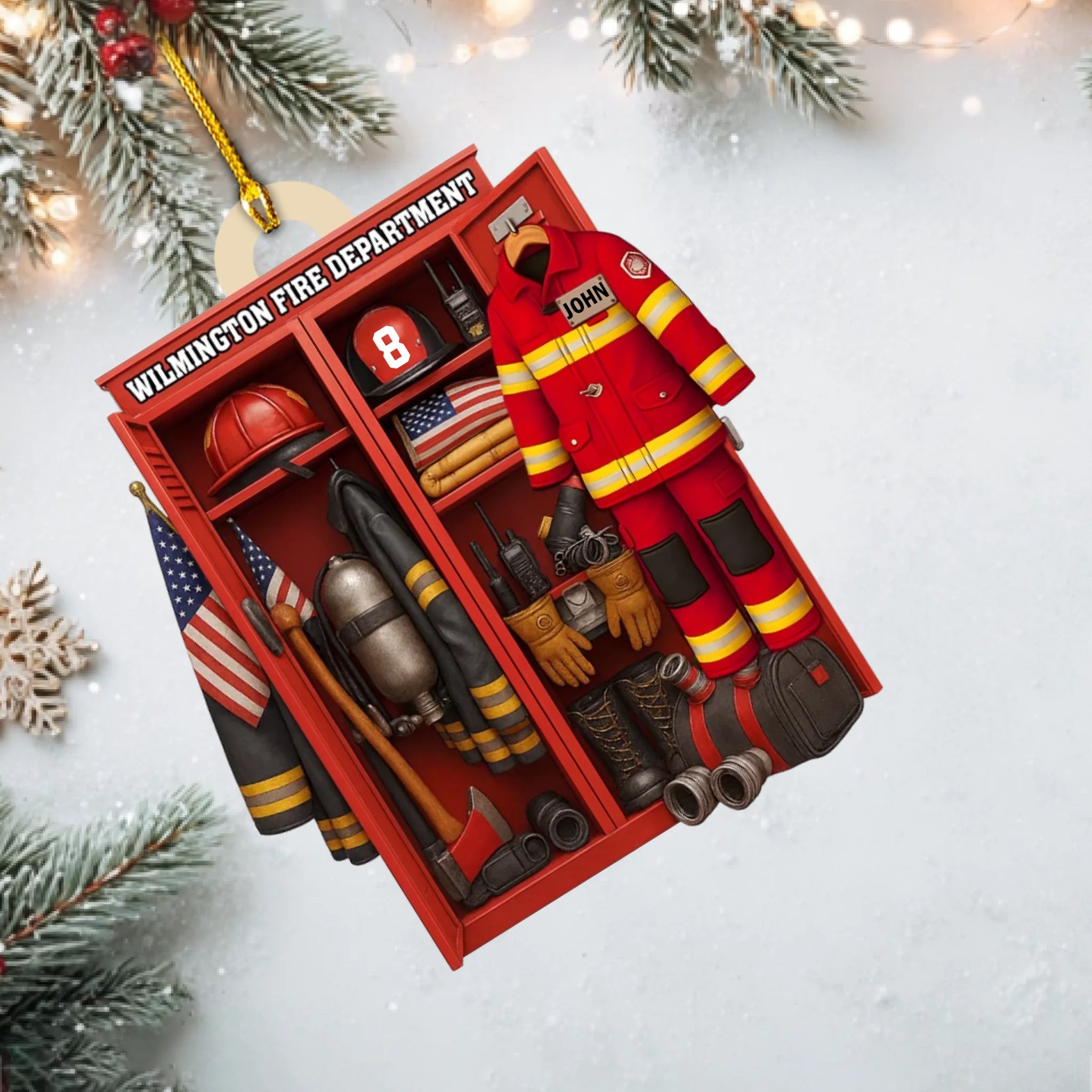 Featuring a detailed fire station locker scene with a customizable fireman uniform, helmet, and number, this ornament perfectly honors those who risk their lives to protect others. Whether displayed on your Christmas tree or hung in your home or car, it’s a meaningful keepsake that symbolizes courage, service, and pride.