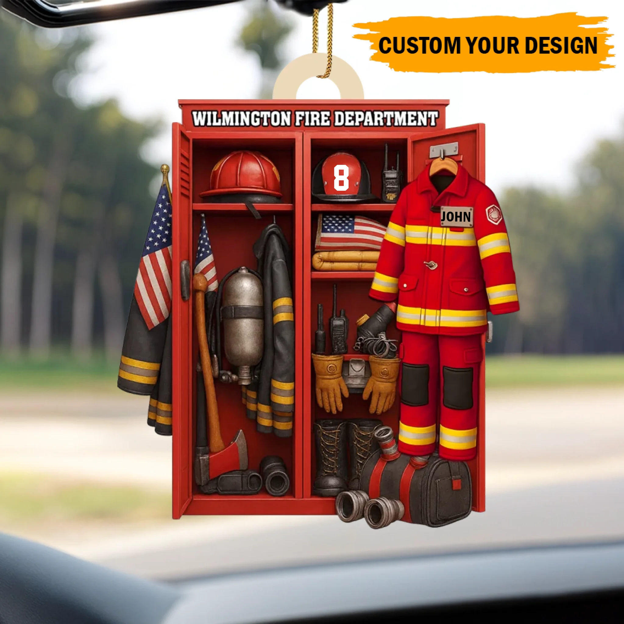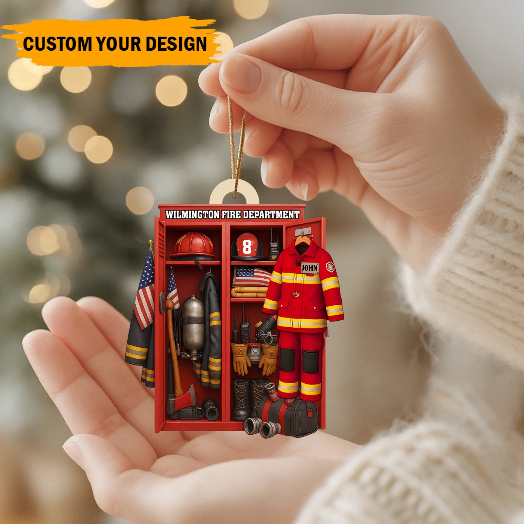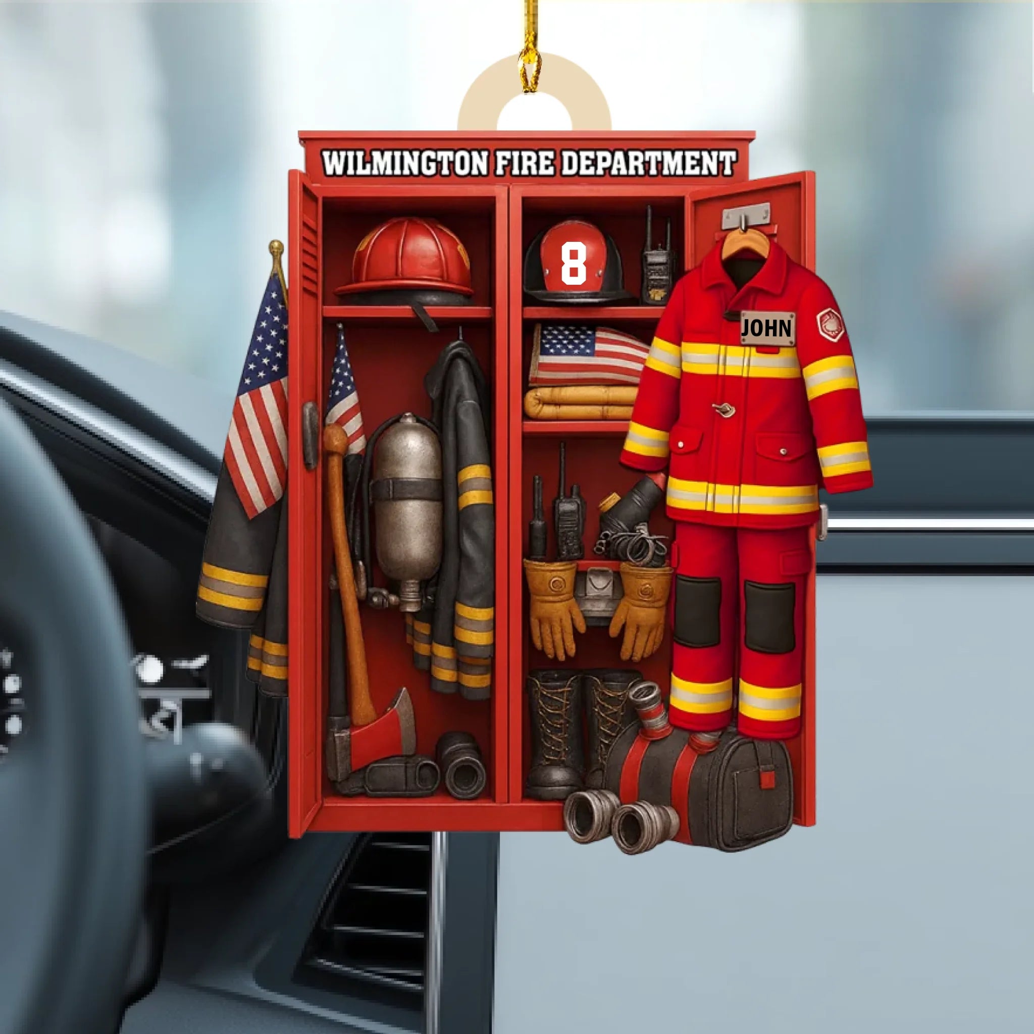Featuring a detailed fire station locker scene with a customizable fireman uniform, helmet, and number, this ornament perfectly honors those who risk their lives to protect others. Whether displayed on your Christmas tree or hung in your home or car, it’s a meaningful keepsake that symbolizes courage, service, and pride.