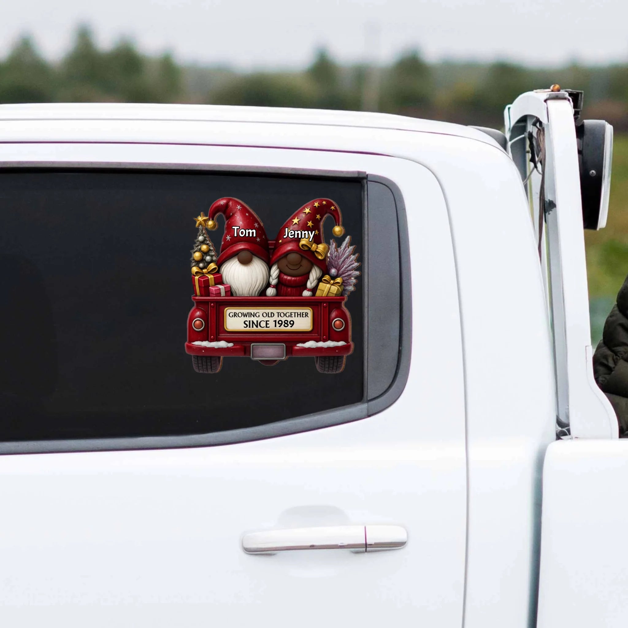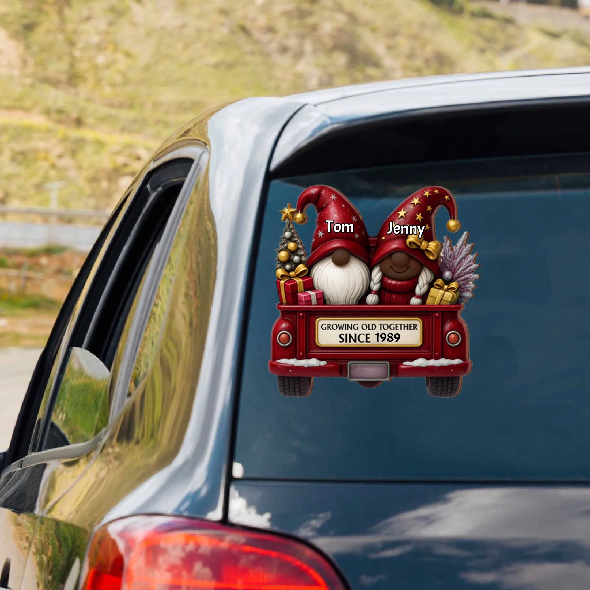 Celebrate love and togetherness with this Personalized Gnome Couple Car Sticker Decal — a charming way to show your bond and add a festive touch to your car, laptop, or any smooth surface. Featuring two adorable gnomes sitting in a cozy red truck with the quote “Growing Old Together Since [Year]”, this decal makes a perfect keepsake for couples who’ve shared countless beautiful moments.