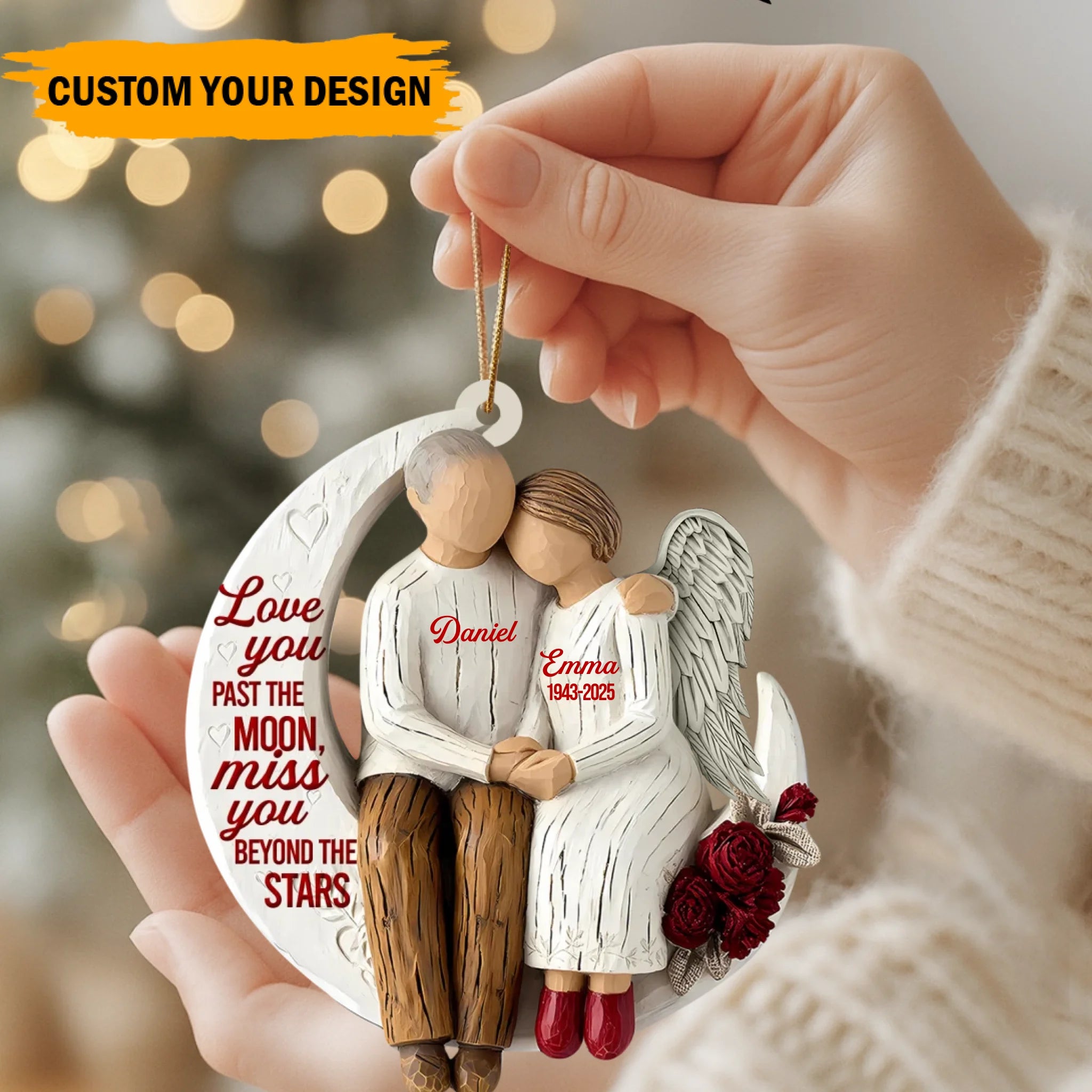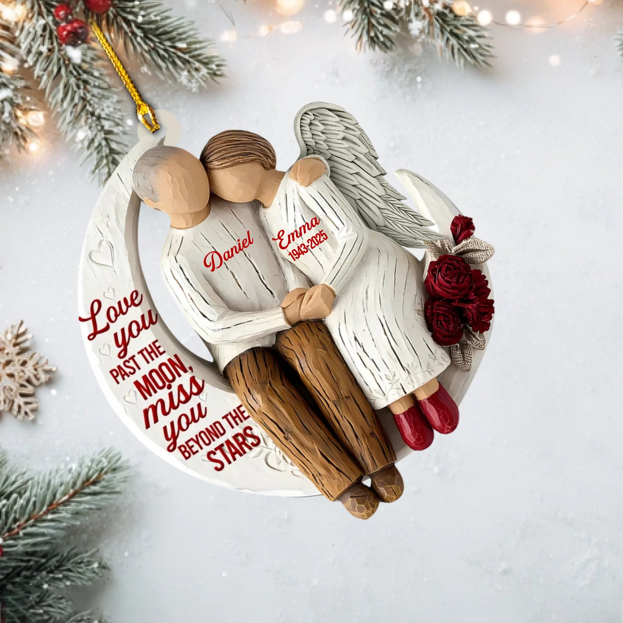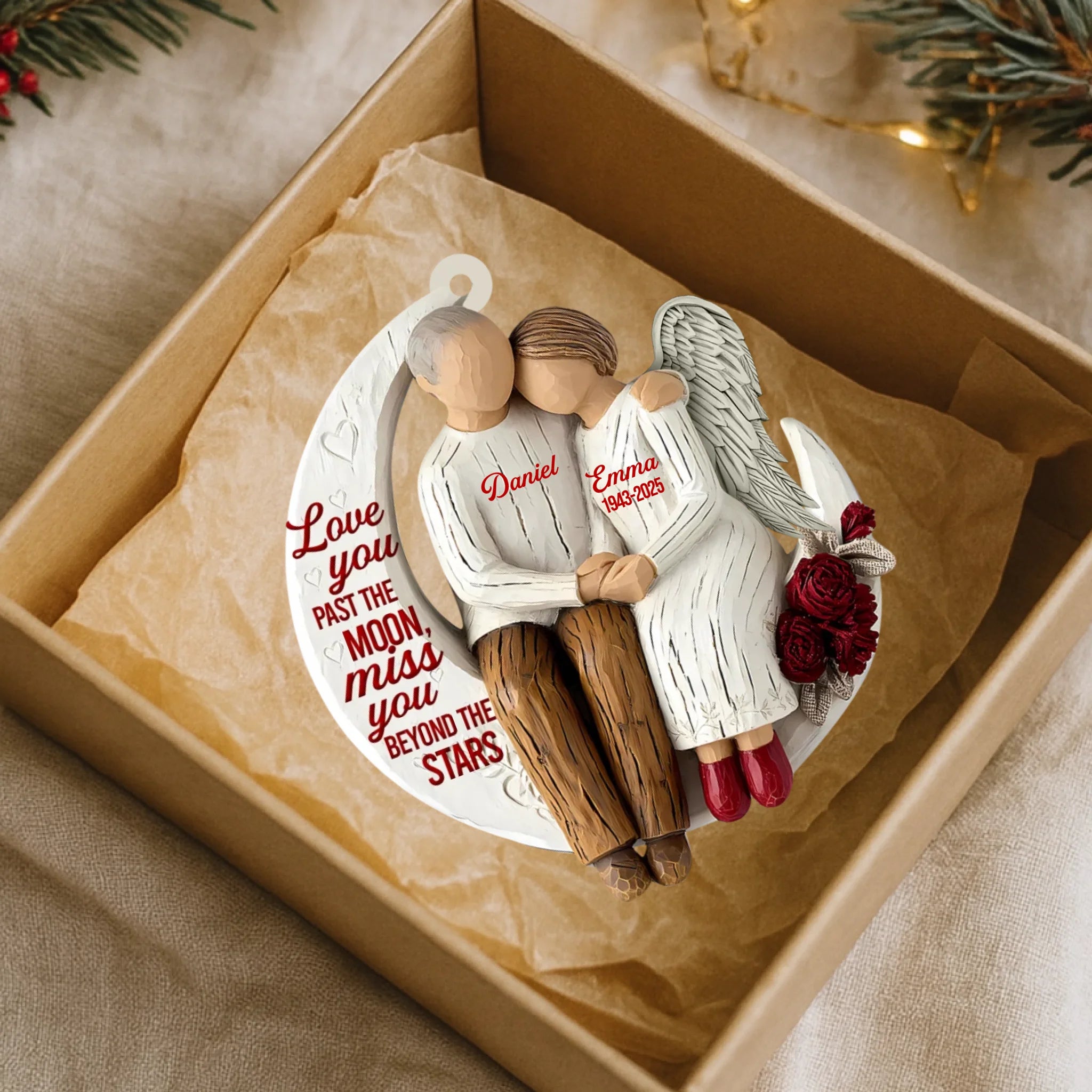 Personalized Memorial Husband and Wife Ornament – Custom Angel Wings Wooden Keepsake | “Love You Past the Moon” Remembrance Gift