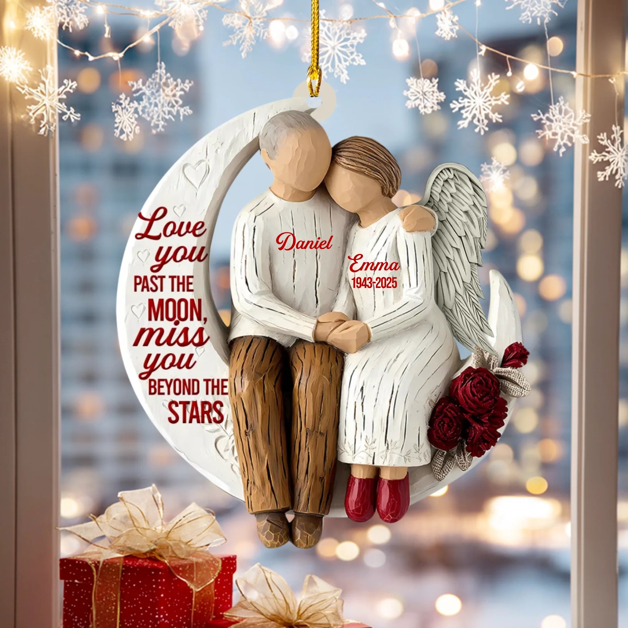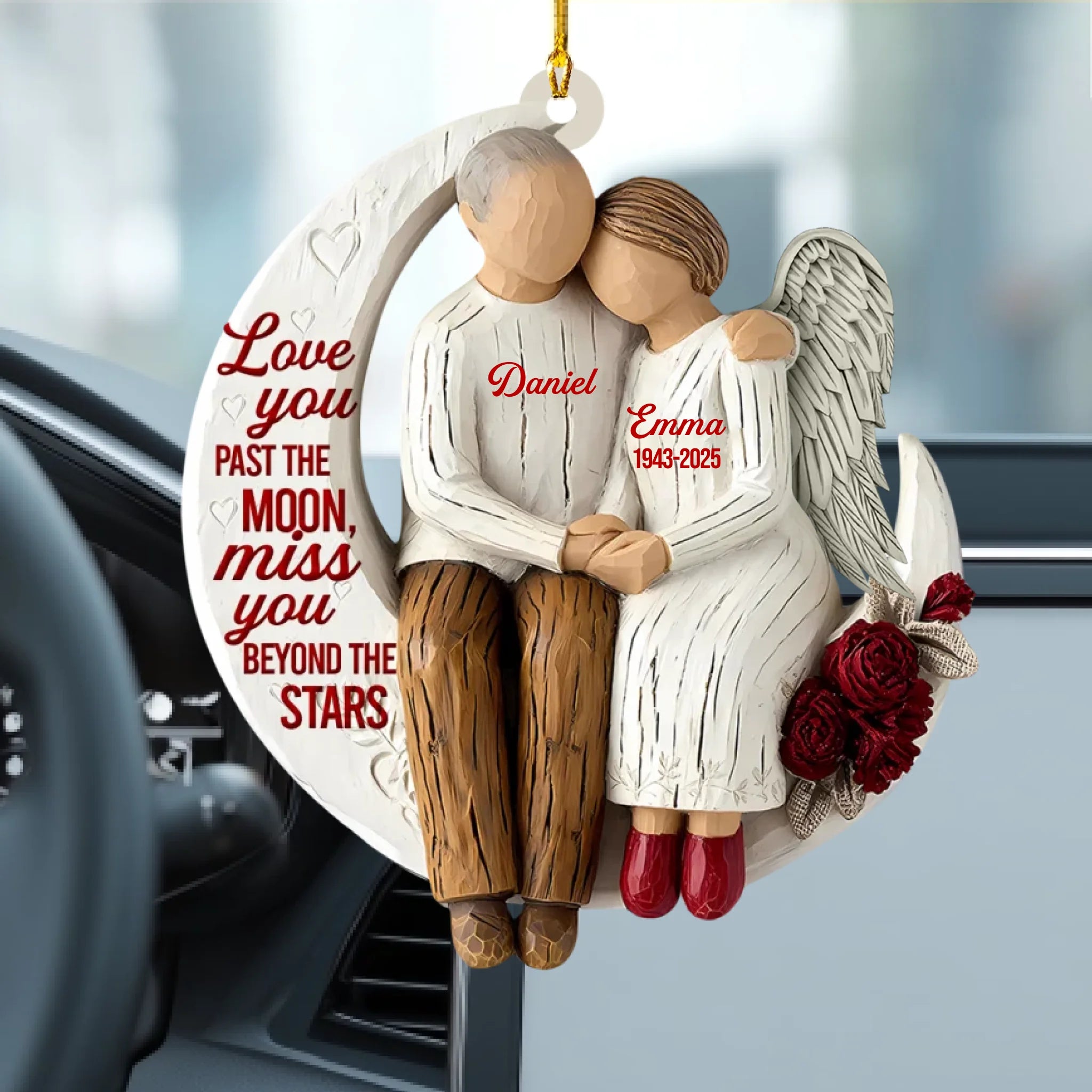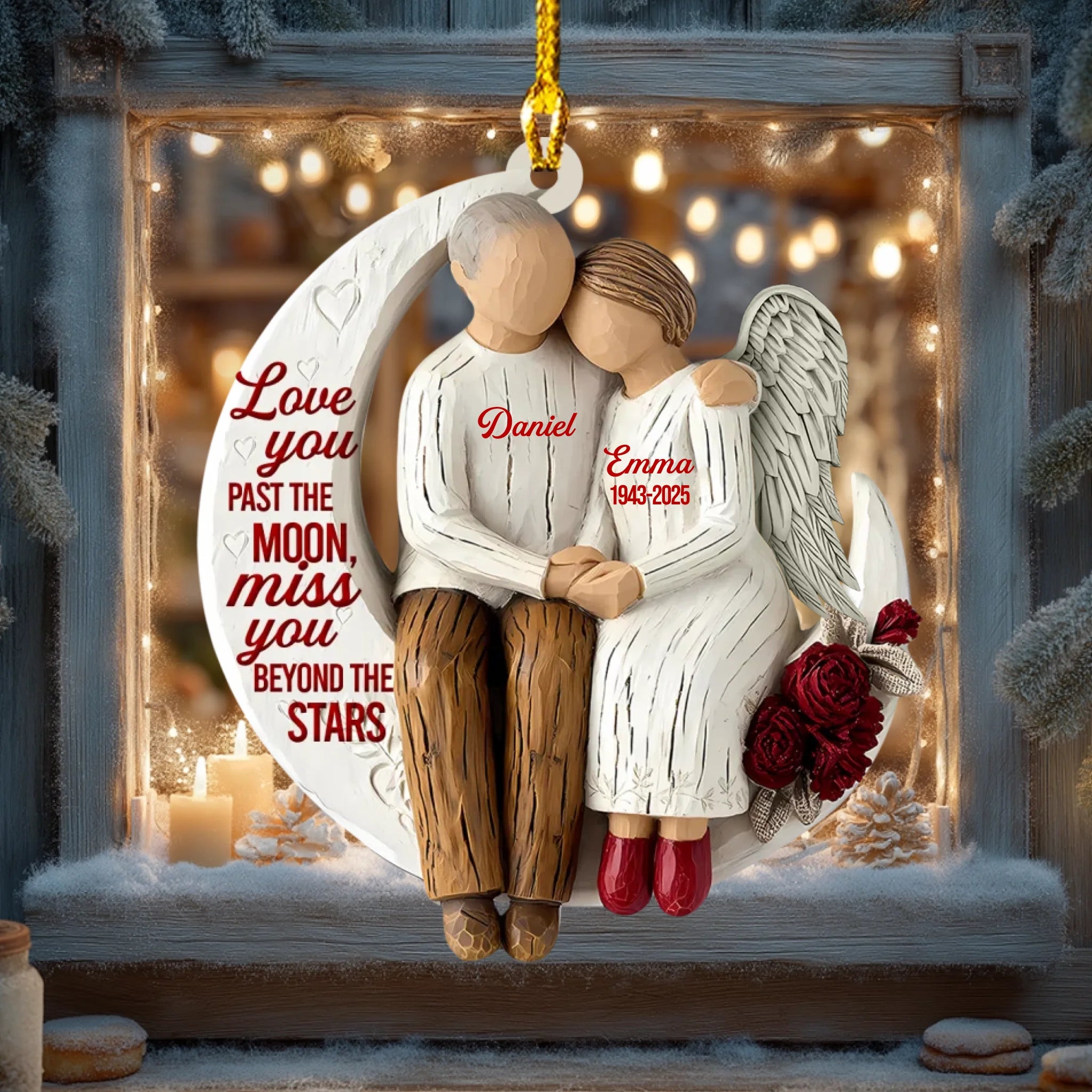 Personalized Memorial Husband and Wife Ornament – Custom Angel Wings Wooden Keepsake | “Love You Past the Moon” Remembrance Gift