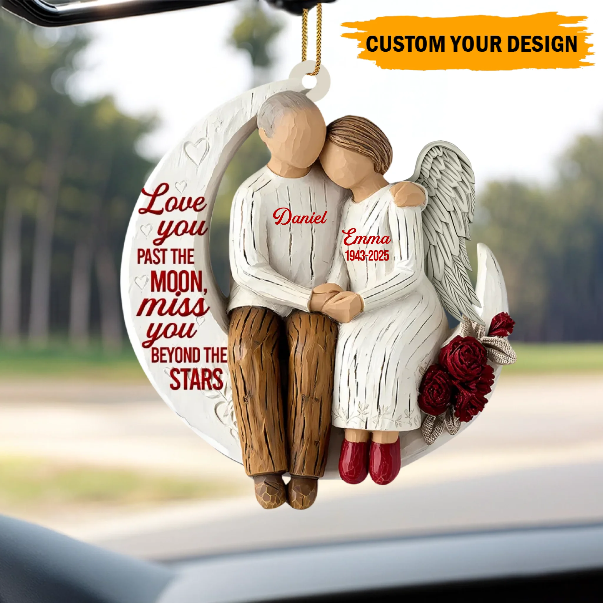 Honor everlasting love with this Personalized Memorial Husband and Wife Ornament with Angel Wings, a heartfelt keepsake that celebrates the bond that transcends time and space. Featuring a tender couple sitting together under the message “Love you past the moon, miss you beyond the stars,” this ornament beautifully represents eternal love and remembrance.