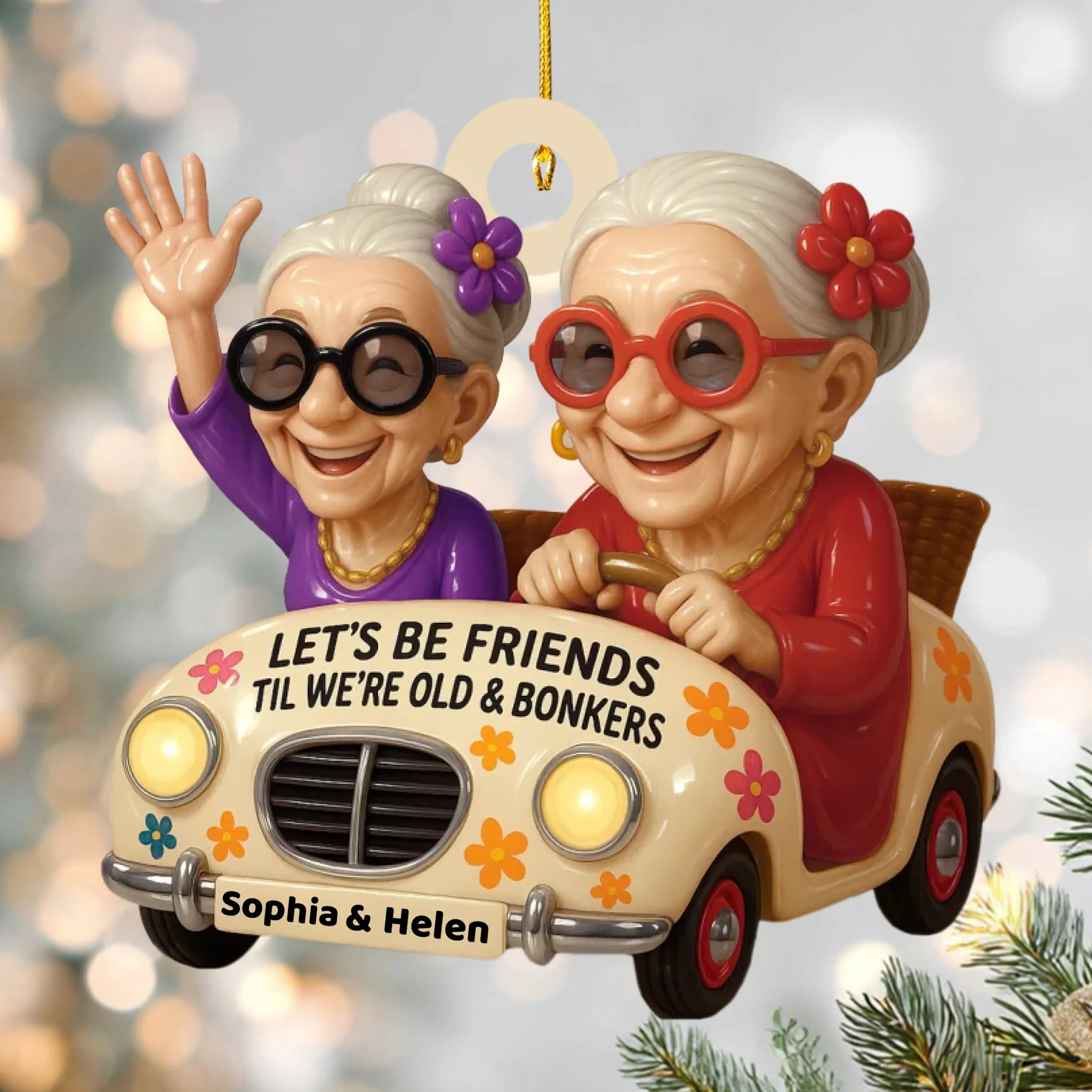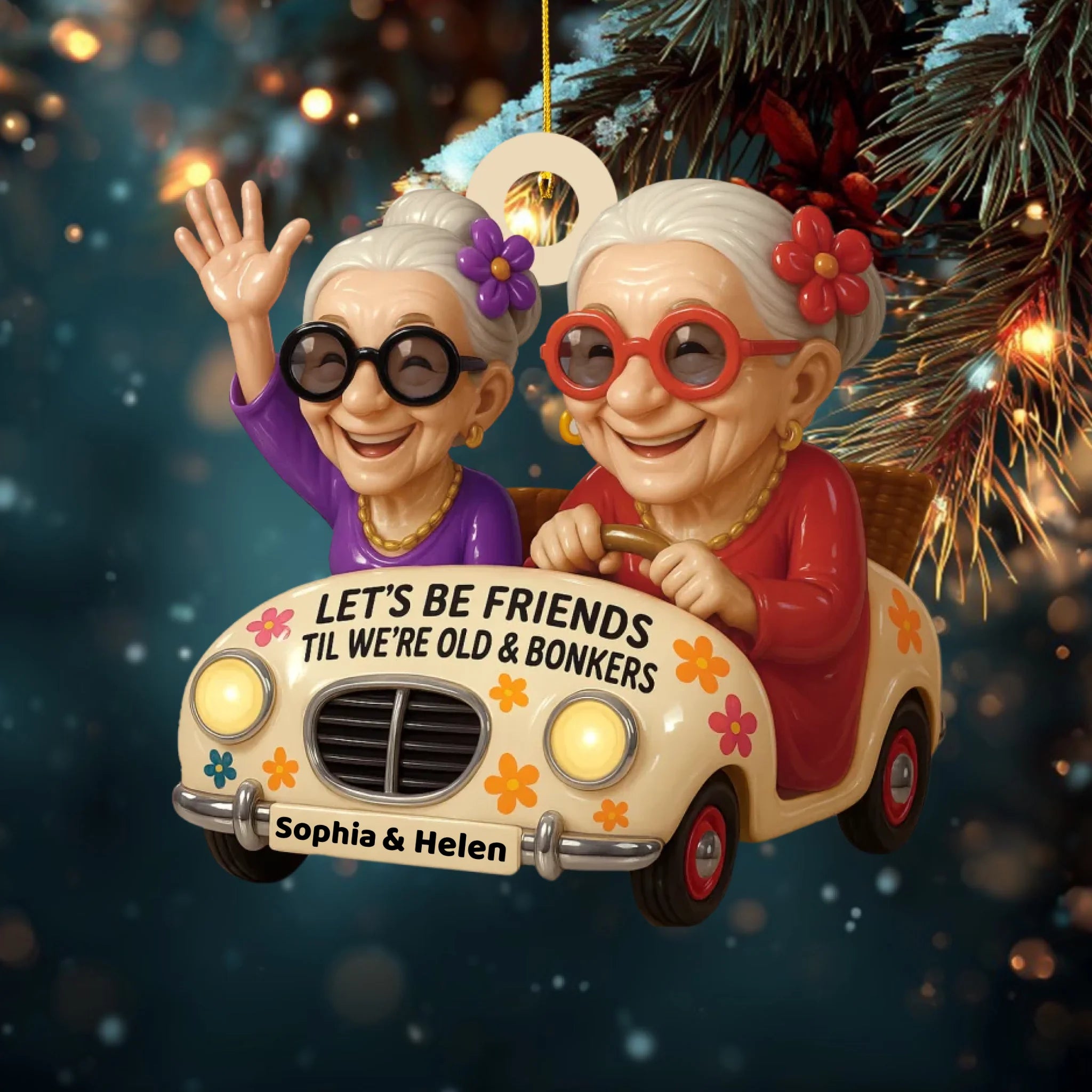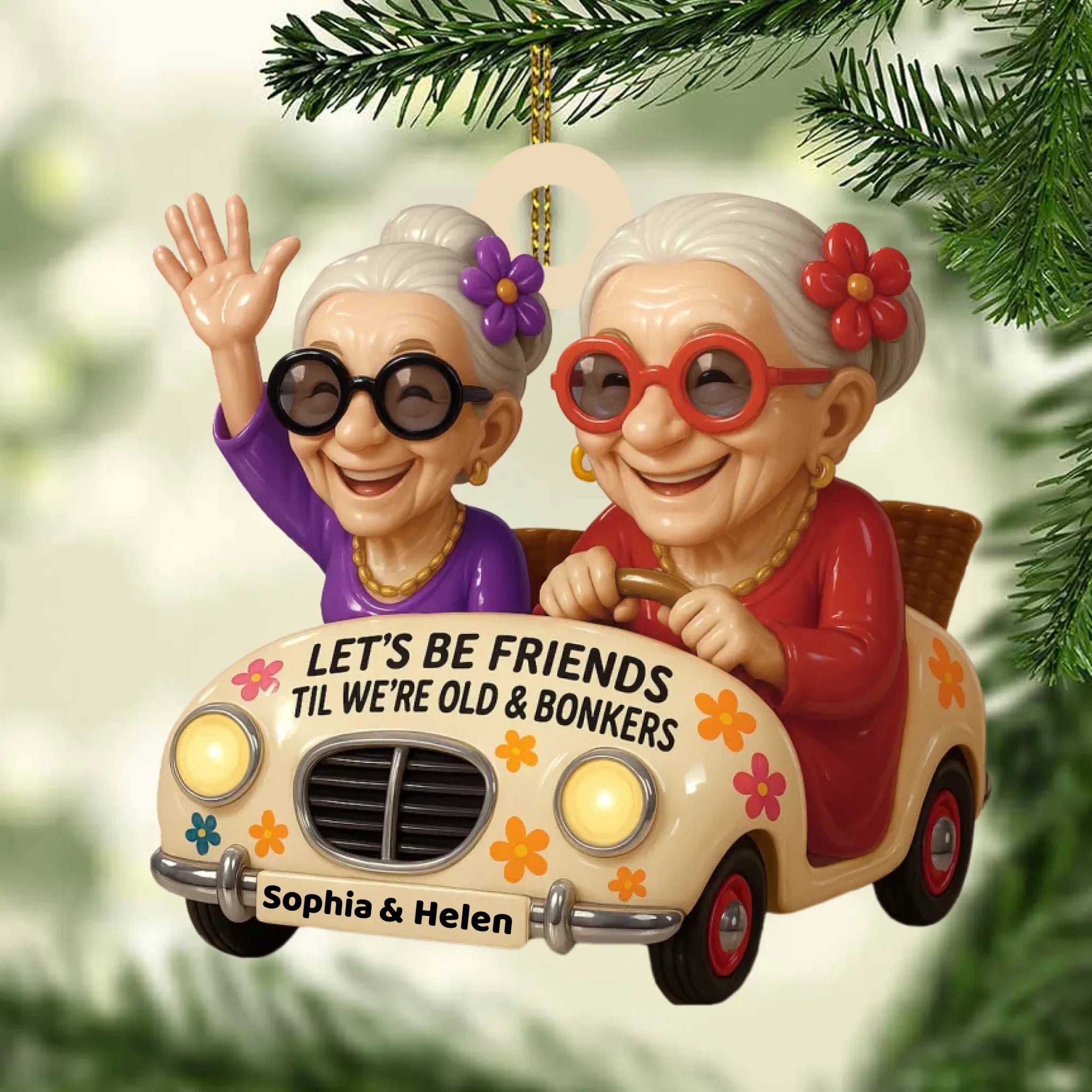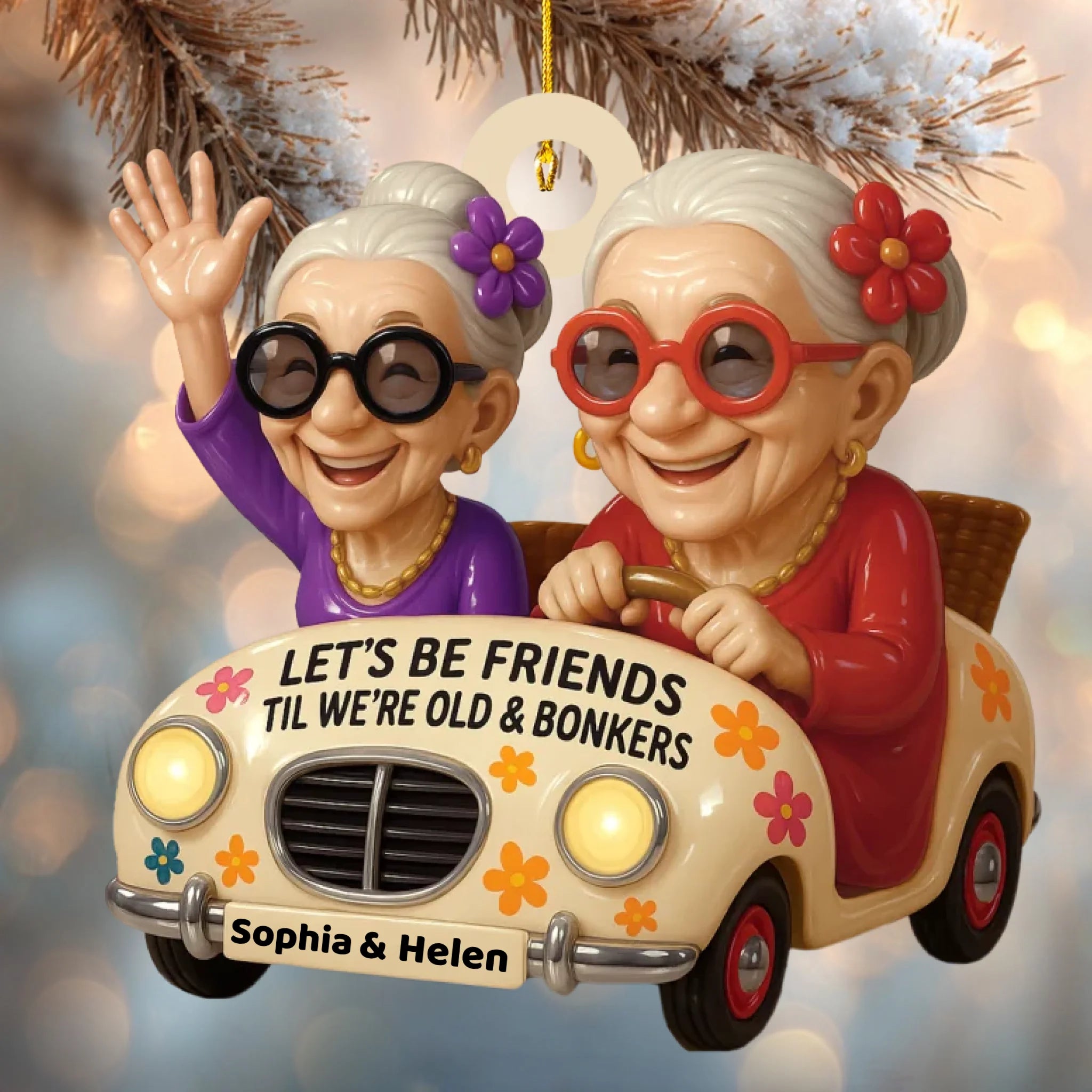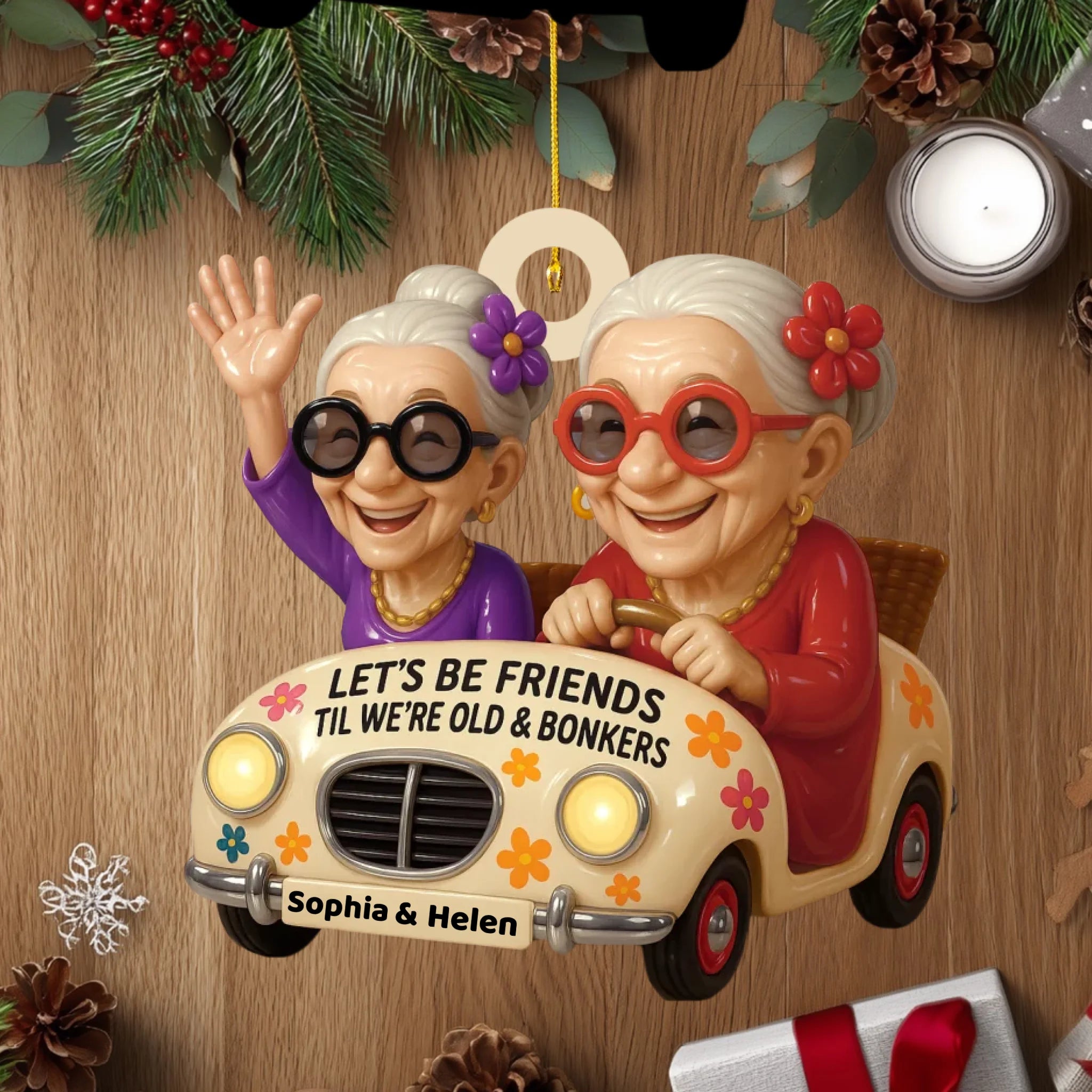 Personalized Sisters Forever Wooden Ornament – Funny Best Friends Gift, Custom Elderly Ladies Keepsake, “Let’s Be Friends Til We’re Old & Bonkers” Car Ornament