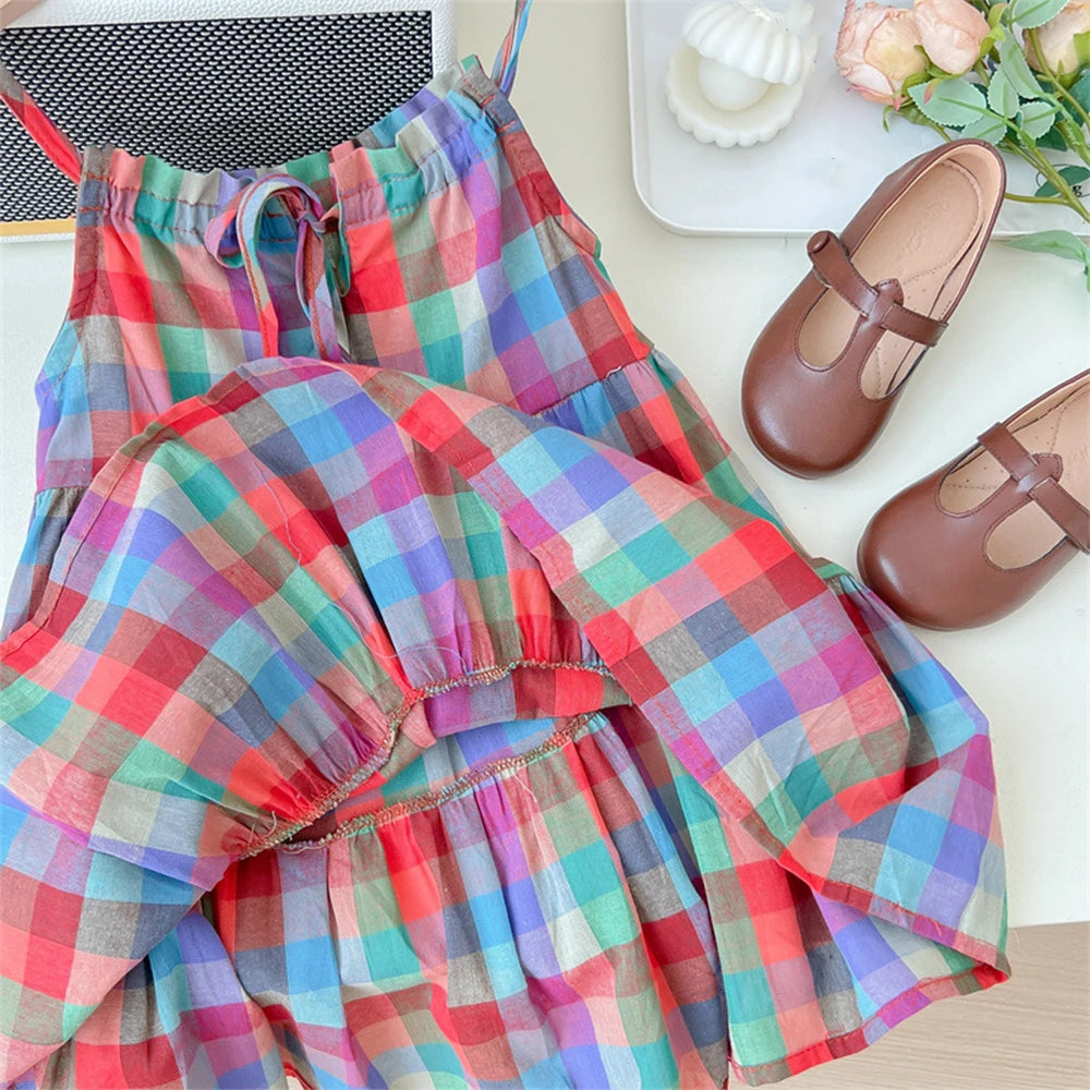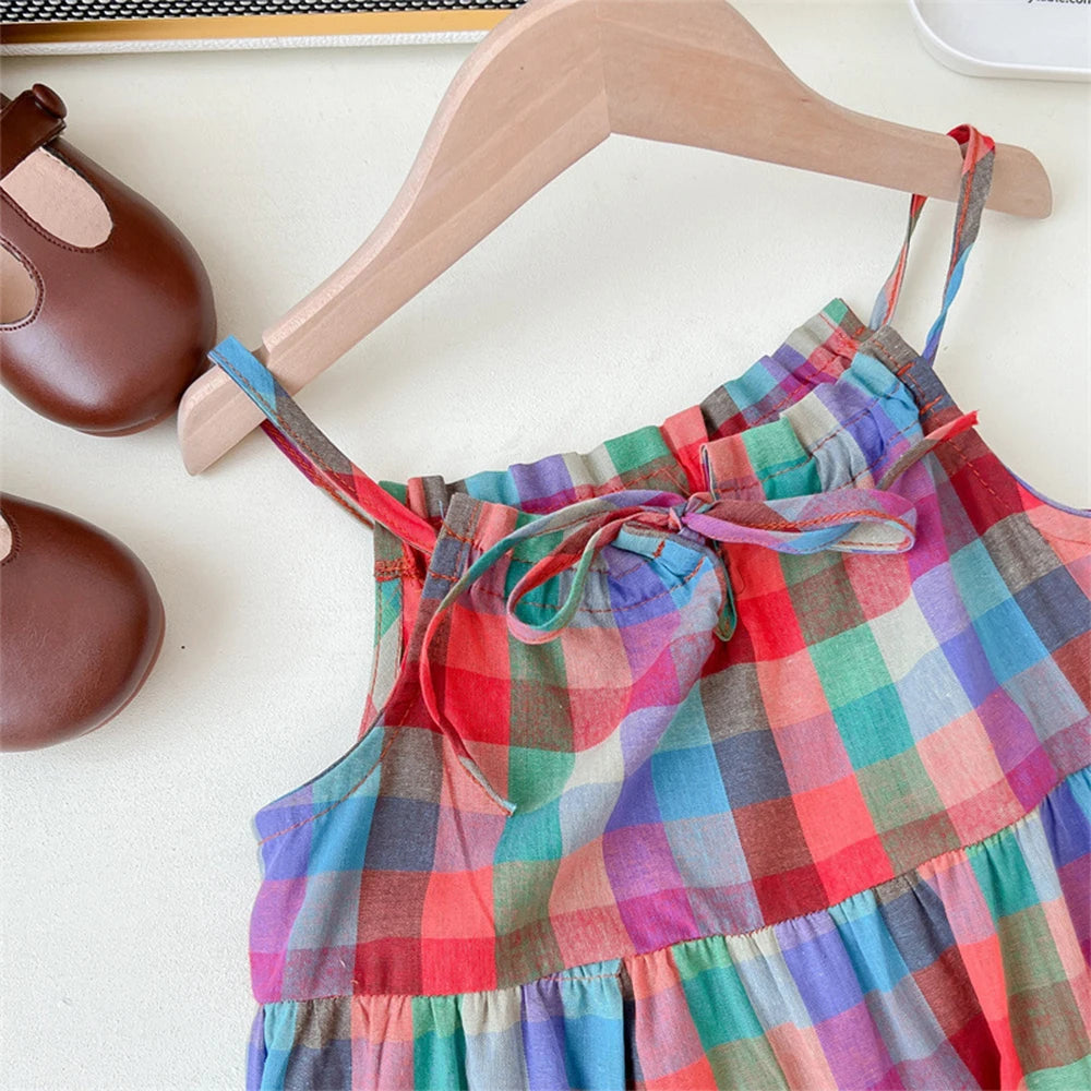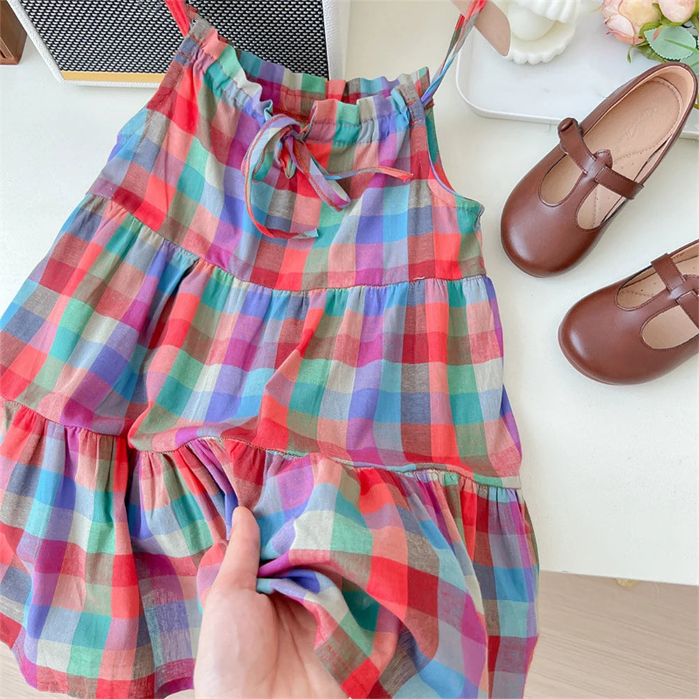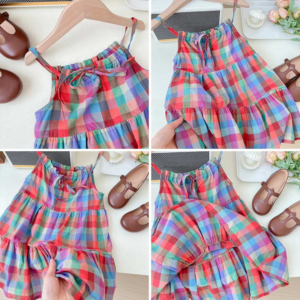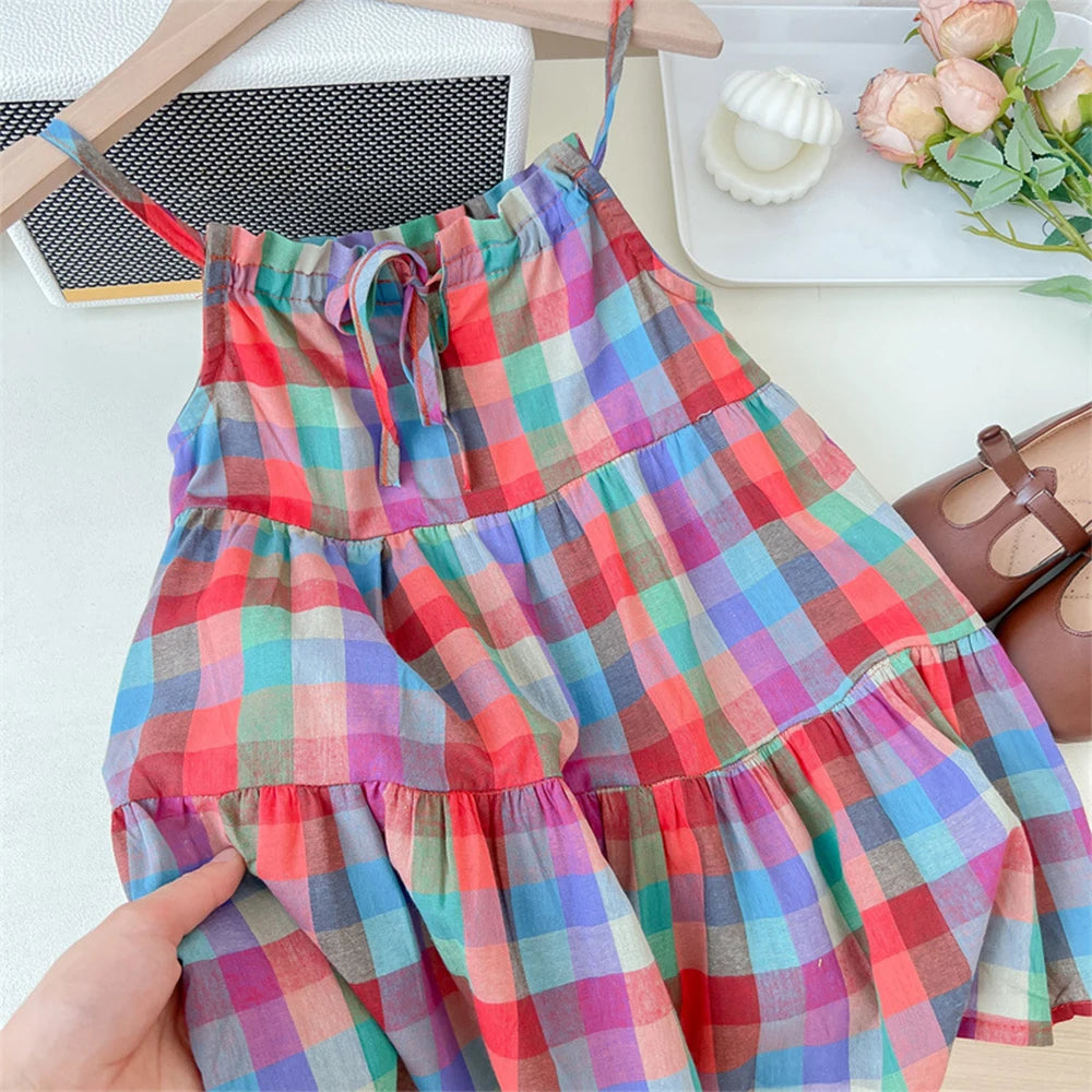 Summer Girls' Colorful Plaid Strap Dress