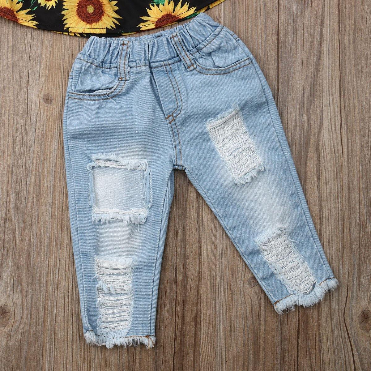 Sunflower Summer Outfit is the ideal dress for baby girls to carry in the summer season. It has an off-shoulder top with a matching headband and ripped jeans. The sunflower print on the top is bright and seems lively giving a cheerful vibe in summer. The top has an off-shoulder neckline with short bell sleeves that provide a stylish design cut to the top. The cotton material of the top is super soft and comfortable to wear. The loose fit of the top makes the top airy and breathable. When paired with ripped jeans and the matching bow headband, the complete outfit looks fashionable and season trendy.