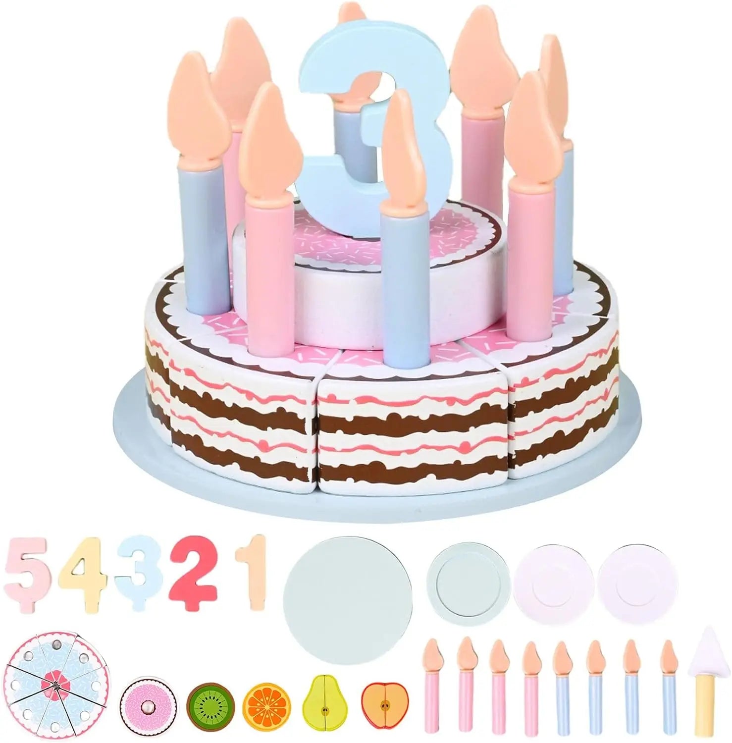 Pièces : 6 parts de gâteau, 9 bougies, 1 couteau à gâteau, 5 décorations en forme de chiffres (1 à 5), 6 fruits tranches, 1 grande assiette à gâteau, 2 petites assiettes, 1 chapeau de fête.