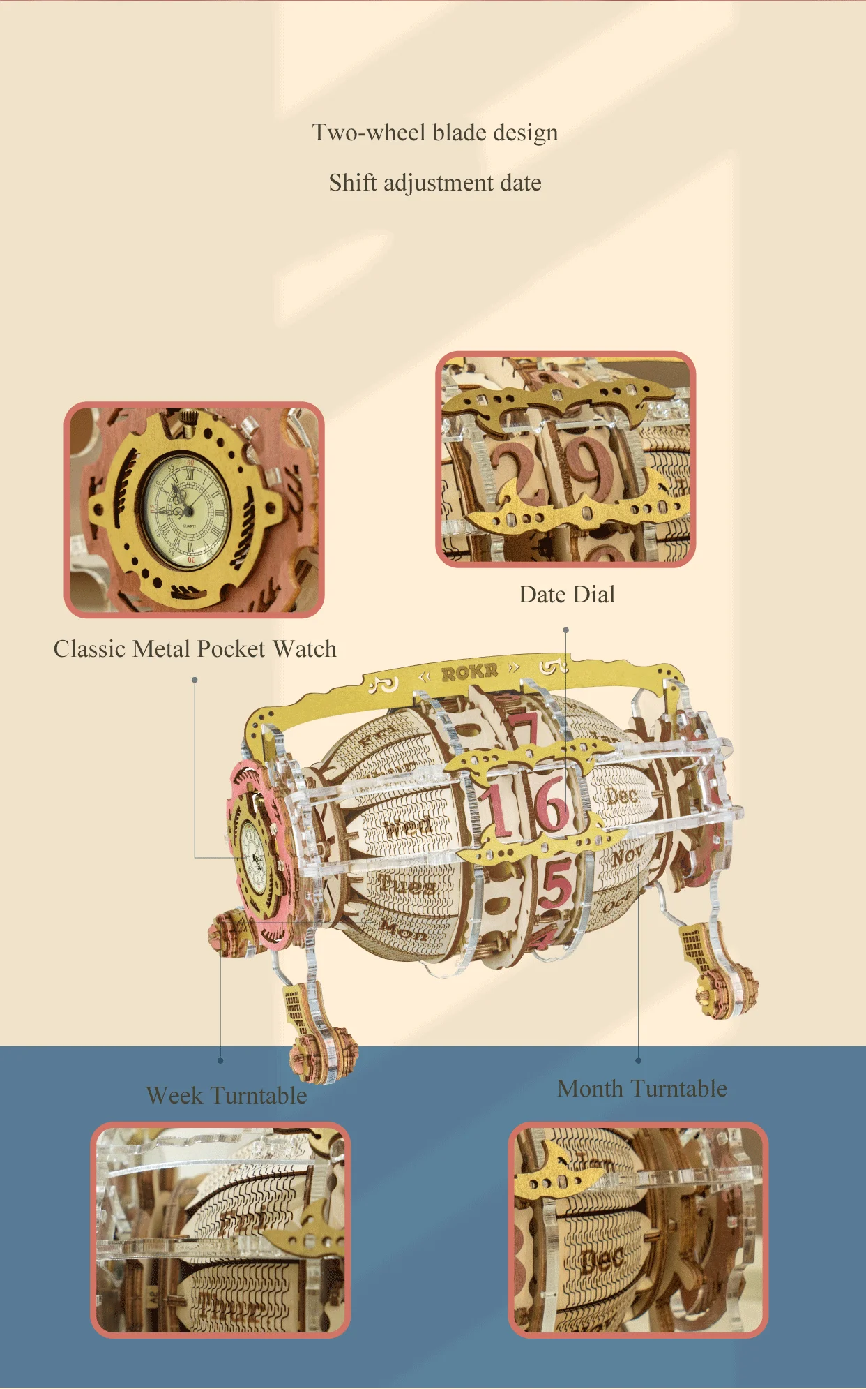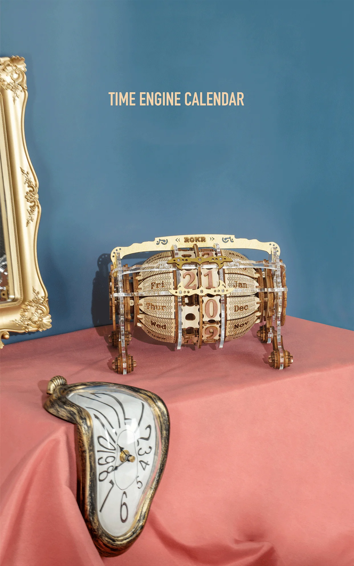- Time Engine Calendar: Wood piece: 250pcs, Assembly time: About 5 hours., Weight:1.14kg, Assemble size: 215x145x146mm, Package size: 306x229x26mm